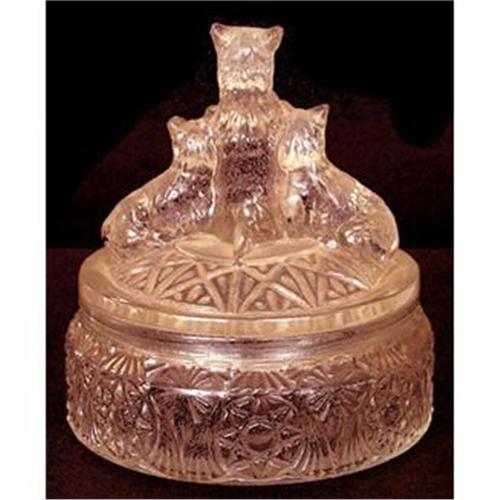 Known as MY PET, this pink Depression glass base, powder jar is shown and described on pages 14-15 in Whitmyer: 'Bedroom & Bathroom Glassware of the Depression Years. Featuring a lid with three Scottish terriers - one central terrier flanked on both sides with pups and produced, circa 1930. The base is encircled with a series of intricately embossed eight sided stars. This Art Deco jar is very well crafted with fine definition to the terrier's features. Measuring 5 inches tall x 4 1/2 inches in diameter. Both the lid and the jar are in excellent condition.