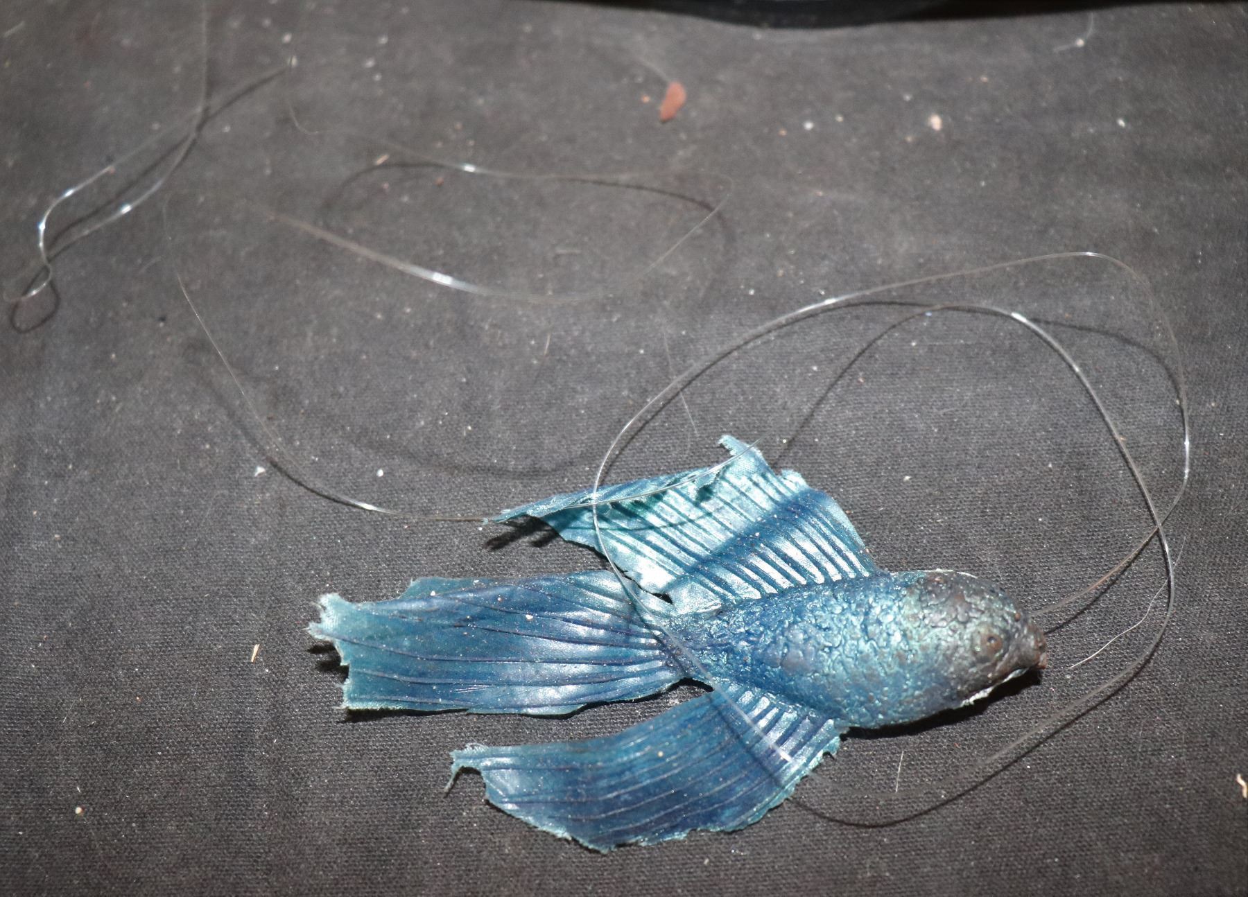 Have not seen this film, but Silicone fish has fishing line so I assume it went flying!