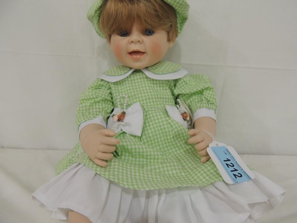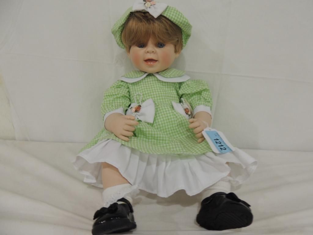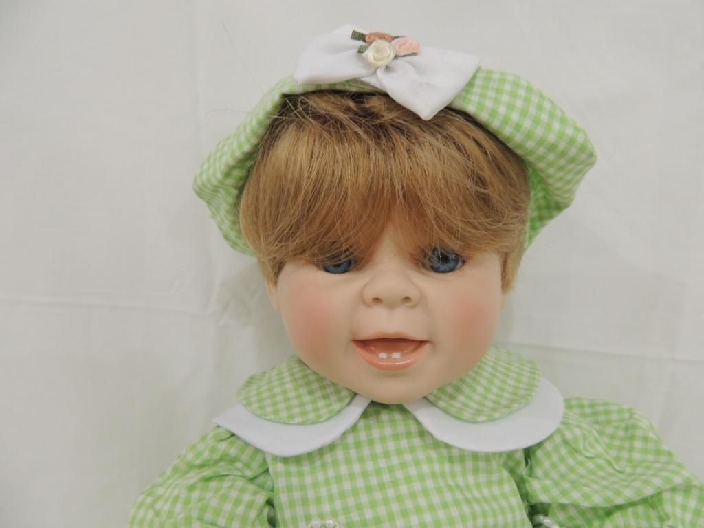 GREEN DRESS AND HAT BABY DOLL 24 INCHES TALL AS SHOWN. SEE PHOTO FOR MORE DETAILS.