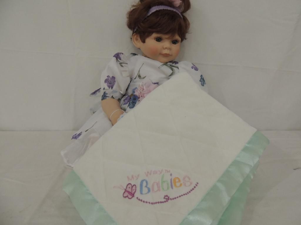 SHORT RED HAIR BABY PORCELAIN DOLL IN BEAUTIFUL EASTER SPRING DRESS HAIR UP IN BOW 20IN TALL AS SHOWN. SEE PHOTO FOR MORE DETAILS.