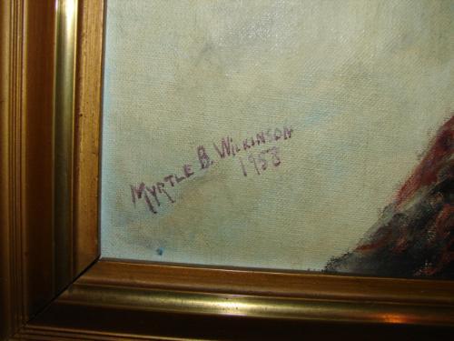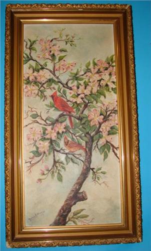 MYRTLE B. WILKINSON OIL ON BOARD. Signed lower left "Myrtle B. Wilkinson, 1958". Depicts two cardinals in tree. Gold frame. Good condition. 13" x 27.5".