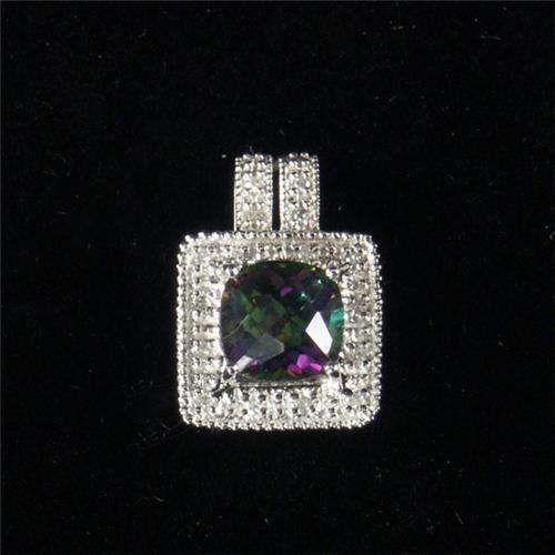 PENDANT: Sparkling 10K white gold cushion cut ''mystic fire'' topaz pendant accented by round cut diamonds. The topaz measures approximately 1.50 cts, is transparent and has purple to green coloring. The diamonds measure approximately 0.10 ctw, have VS1 to SI1 clarity and G color. Appraisal included.