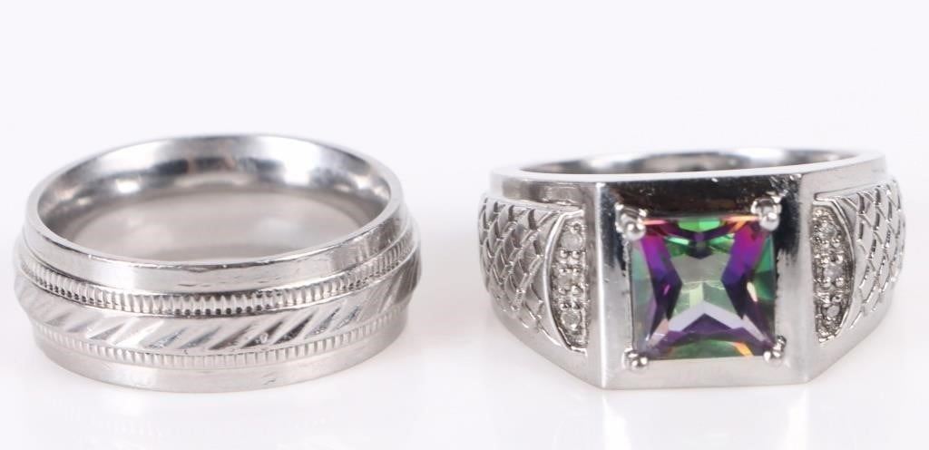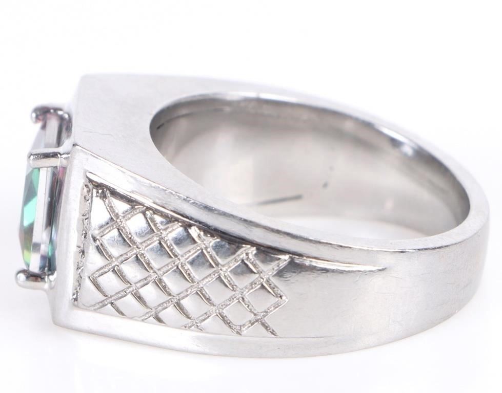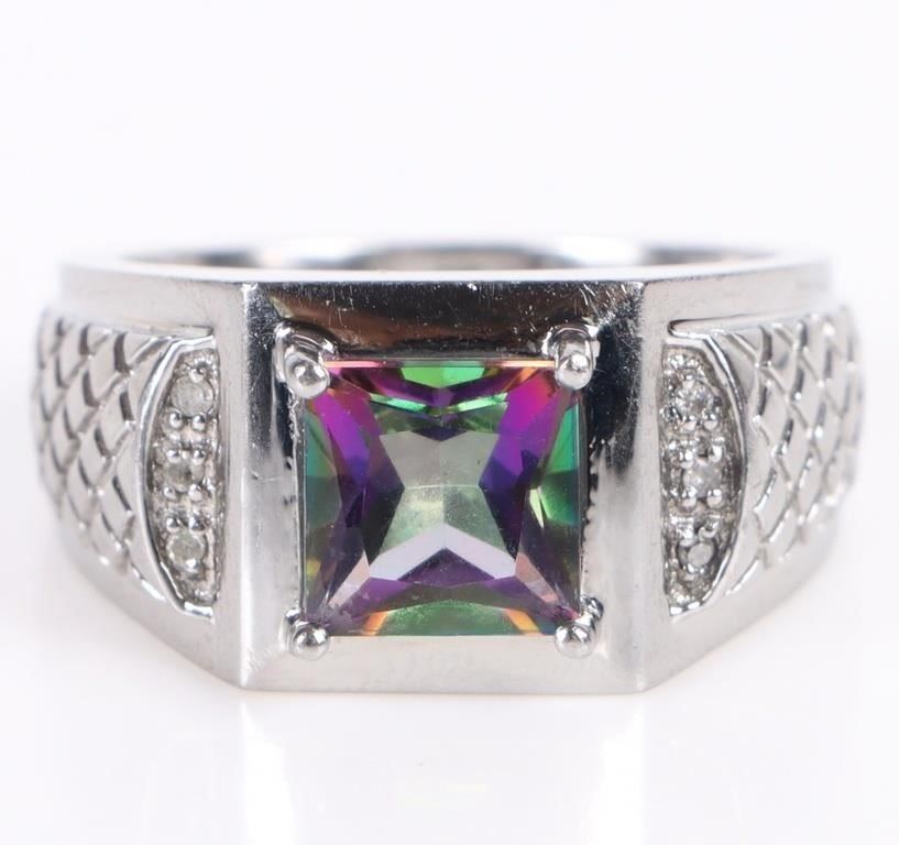 Mystic topaz diamond textured mens ring set. Gemstones to include one 3.00ct Princess cut mystic topaz and six 0.01ct round cut diamond.