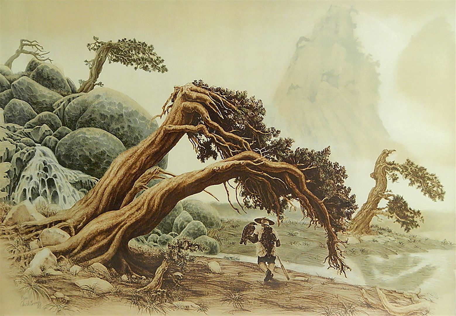Lithograph on paper, limited edition by Charles Lynn Bragg. A man and an eagle walk in perfect harmony in a mysterious land. 29.5 x 21