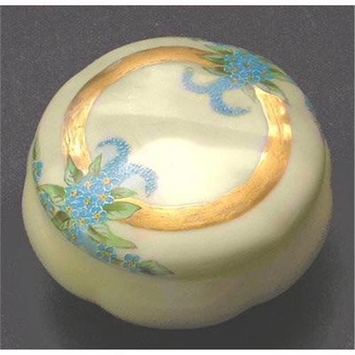 The Moritz Zdekauer Austria marking on this wonderful Art Nouveau vanity jar dates it to about 1900. Pretty hand painted blue flowers adorns the yellow and gold lid, the base is also yellow and stands on three gold feet, while the inside of jar has a lustre finish. Measuring nearly 5 inches in diameter x 2 3/4 inches tall including its lid and in excellent condition without any damage or crazing