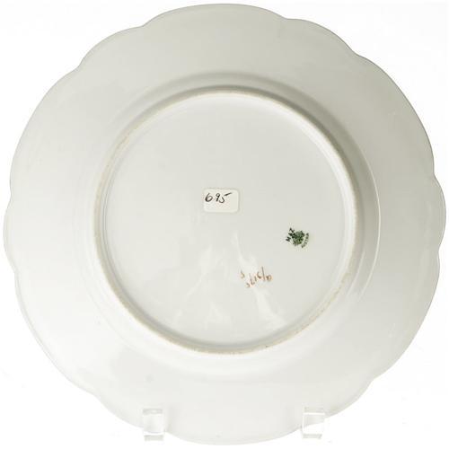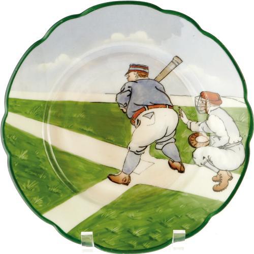 <B>MZ Austria China Baseball Plate</B></I> made in Austria for the American market by Moritz Zdekauer, circa 1900. The face shows a catcher squatting behind a rather pudgy player going up to bat. Hand-painted with MK AUSTRIA and Habsburg eagle in dark green underglaze. 9.625" diameter, excellent condition.