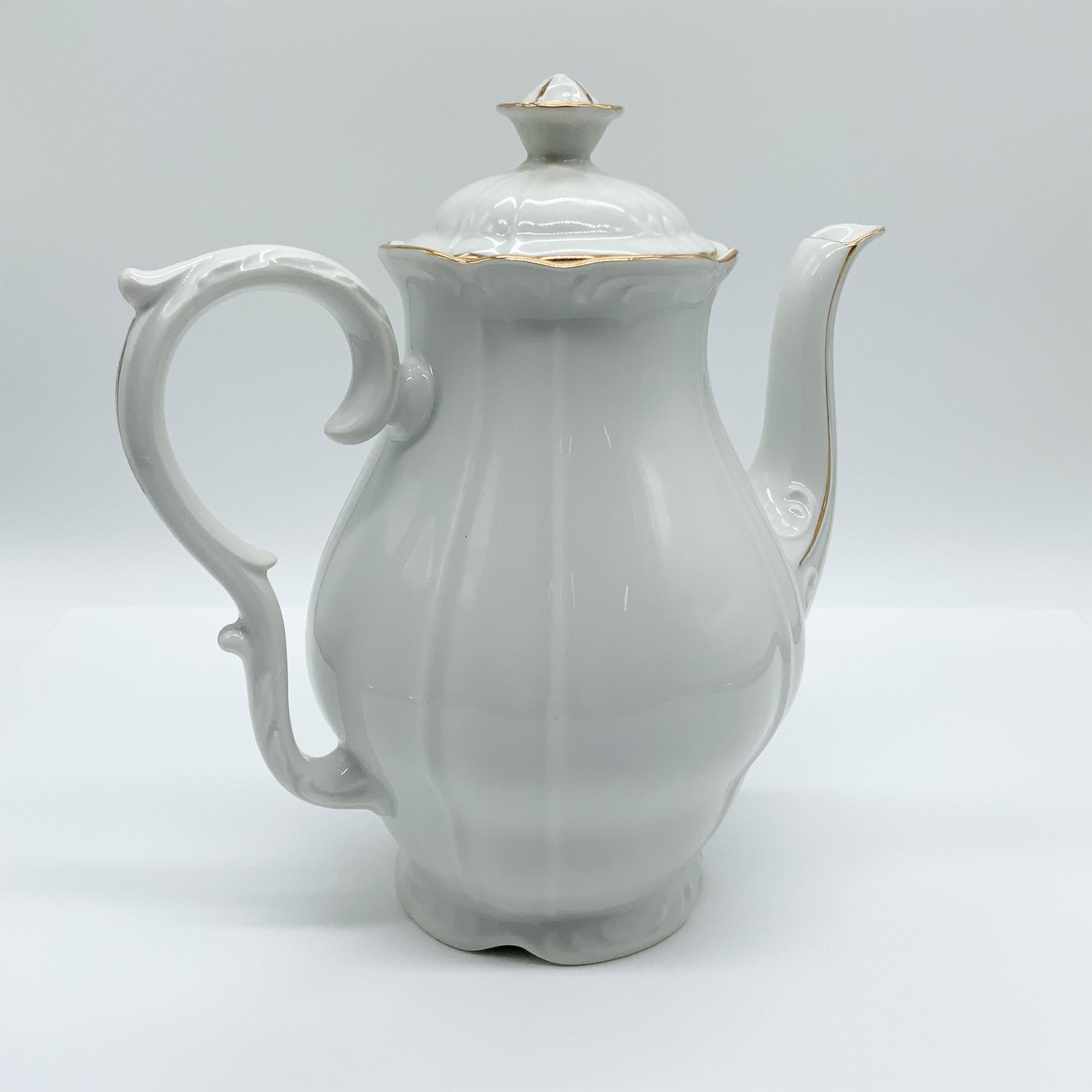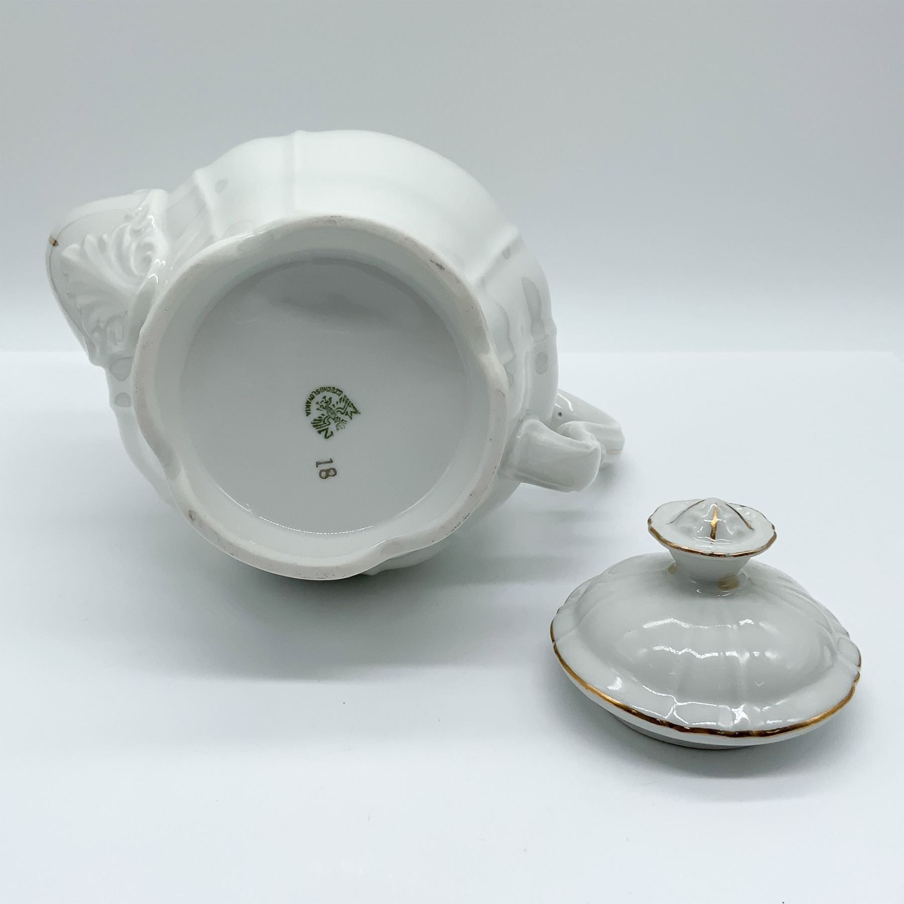 Elegant porcelain teapot by MZ Czechoslovakia, featuring a fluted design with gold trim and ornate detailing. Complete with a matching lid and marked with the MZ Czechoslovakia backstamp.