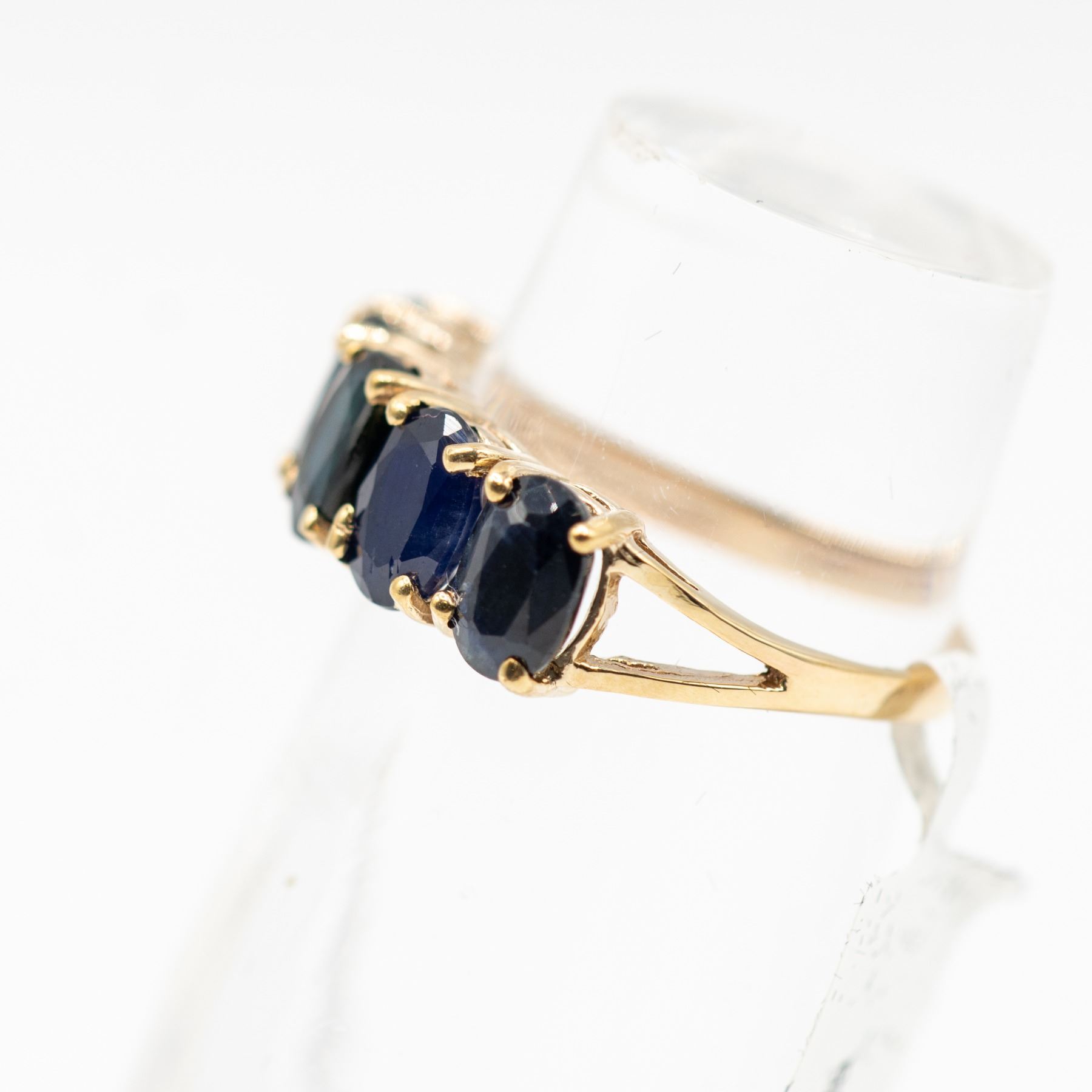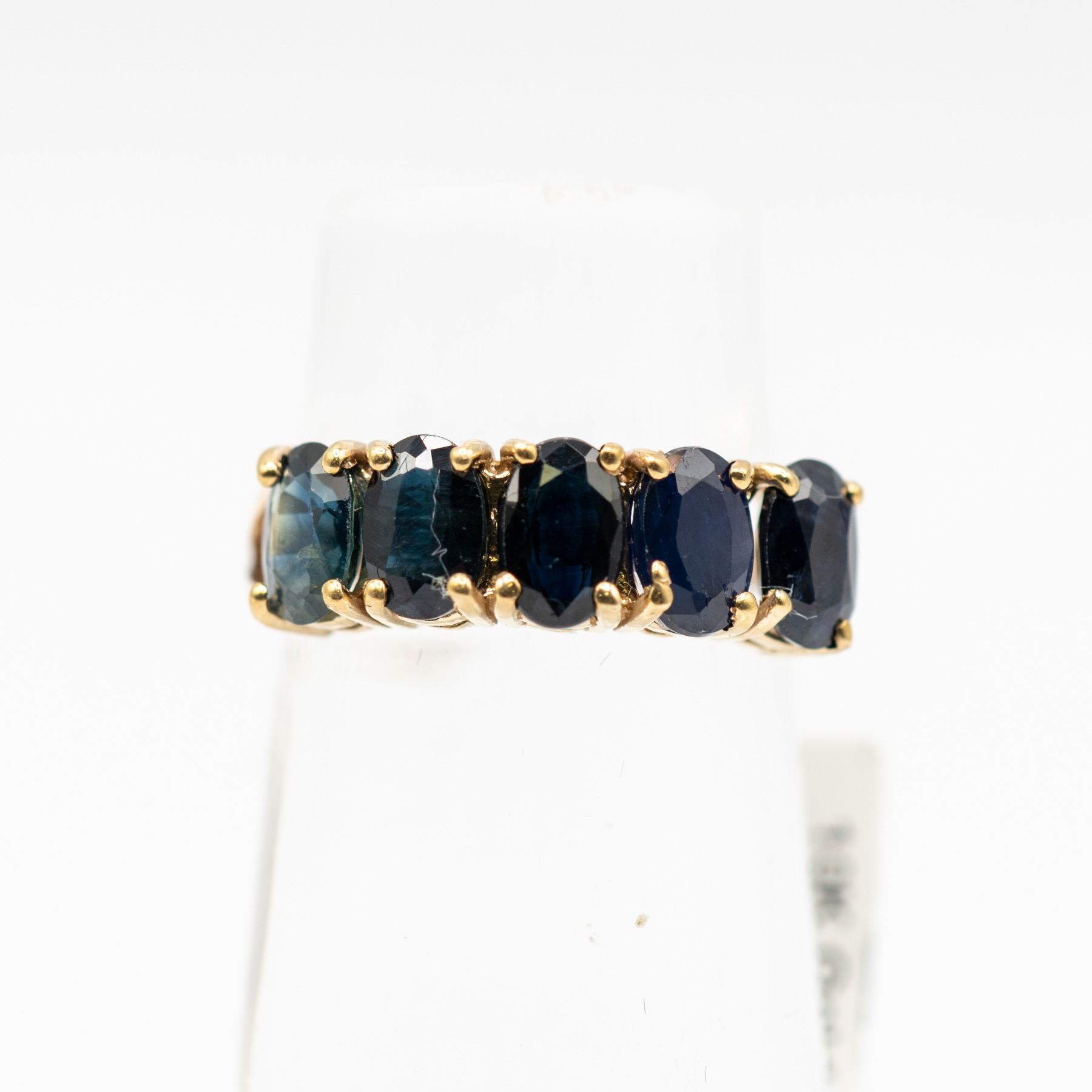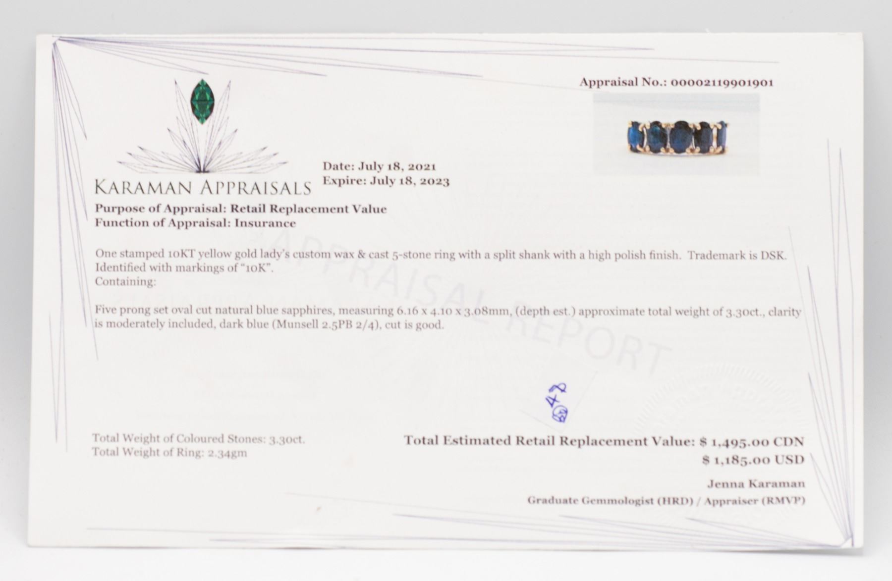 5 STONE SPLIT SHANK HIGH POLISH RING. OVAL CUT NATURAL BLUE SAPPHIRES, MEASURING 6.146 x 4.10 x 3.08mm. CLARITY IS MODERATELY INCLUDED, DARK BLUE, CUT IS GOOD. COMES WITH CERTIFICATE OF AUTHENTICITY, VALUED AT $1495.00