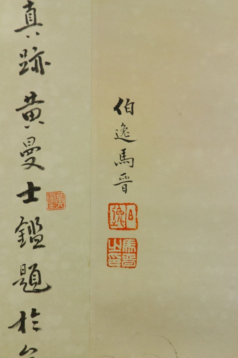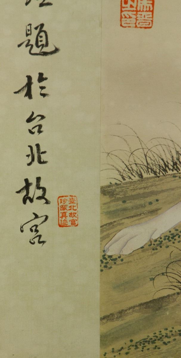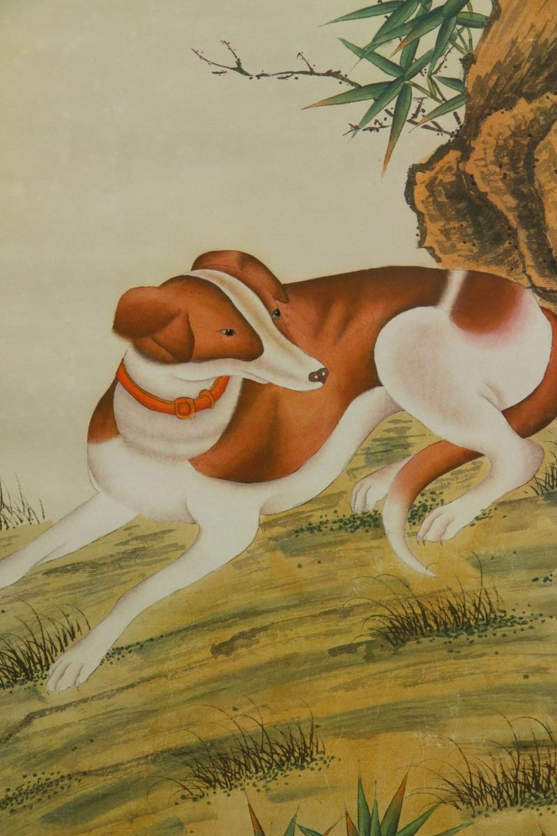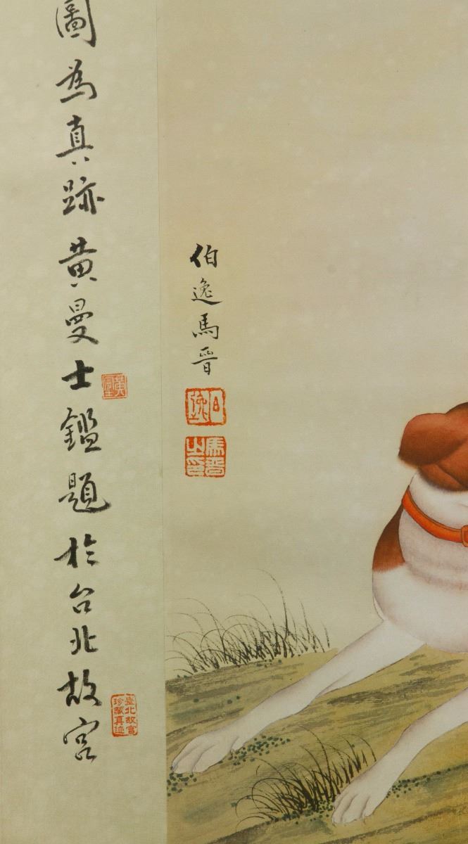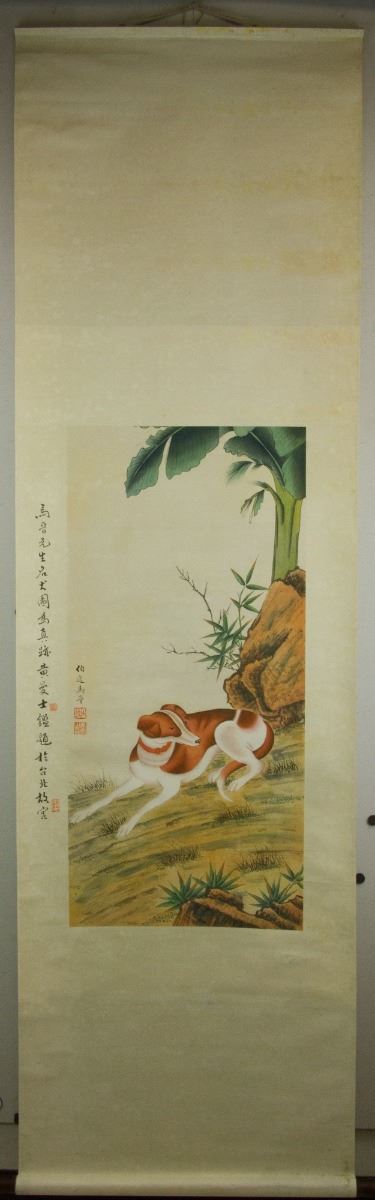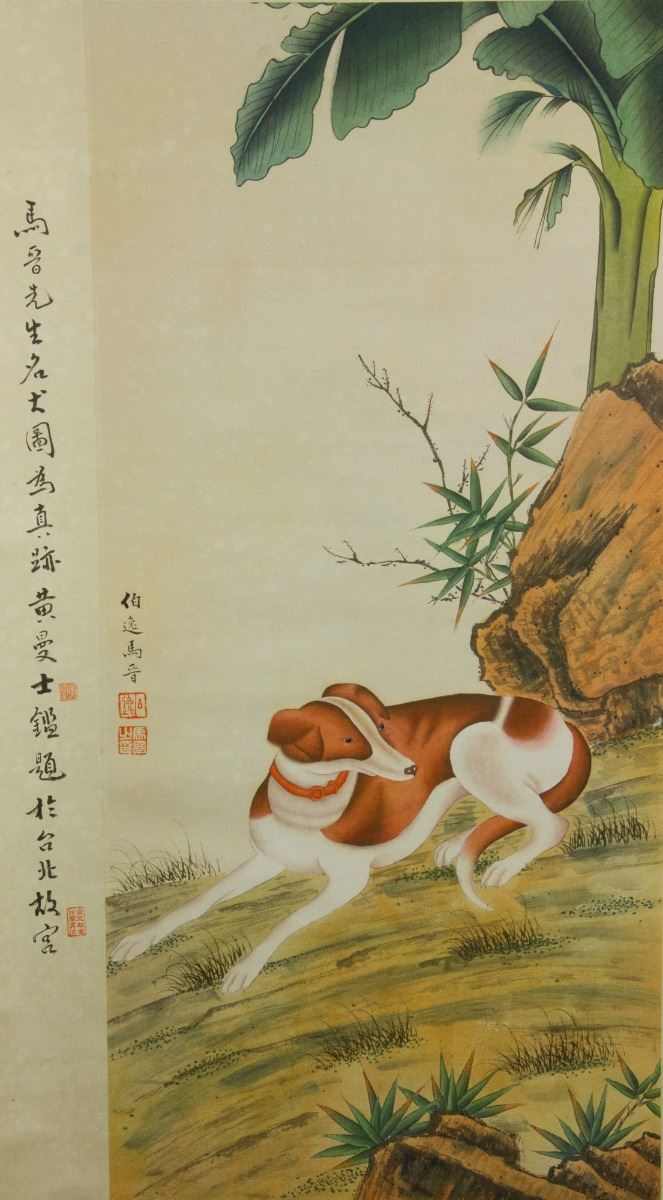Chinese hound crouching under a musaceae tree; Chinese ink and watercolour on paper; hanging scroll; signed Ma Jin (1900-1970); inscribed with two artist seals; with one seal of appraiser Huang Man, and one stamp of National Palace Museum; 92 cm × 44 cm