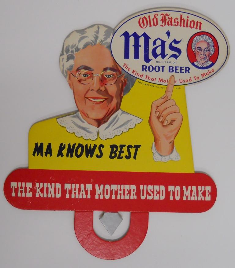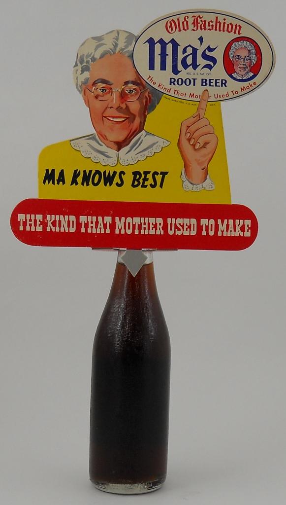 This is a cardboard die-cut sign / bottle topper for Ma's Root Beer. These were used years ago to help advertise bottles of soda in stores. You folded the neck back and placed the sign over the top of a bottle of soda.
