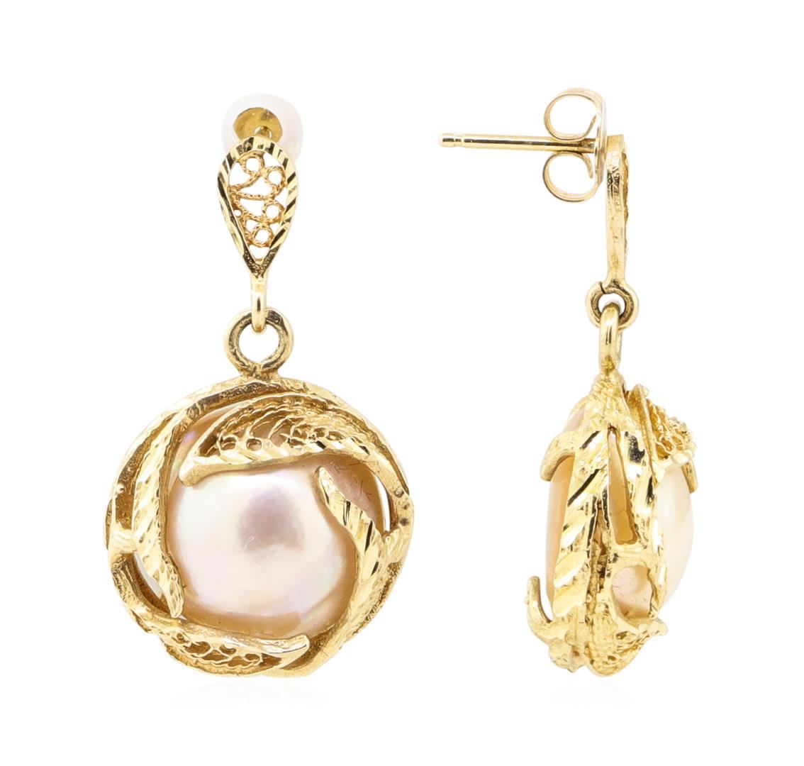 One pair of mabe pearl dangle earrings with a drop of approximately 30 millimeters featuring: 14KT yellow gold weighing 8.1 grams containing two mabe pearls measuring approximately 14 millimeters in diameter.