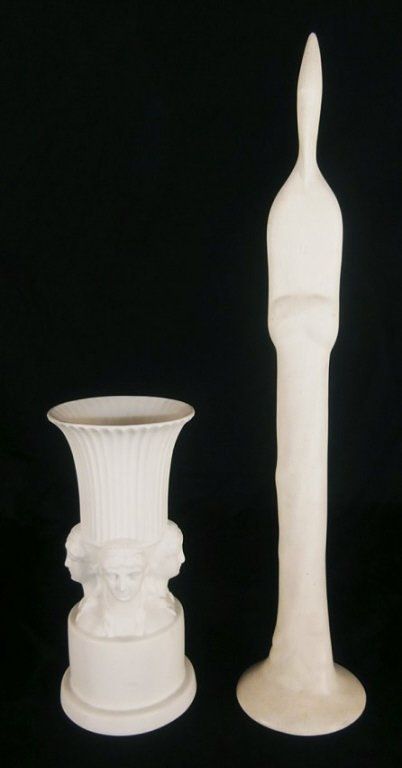 Mabel, Figural column porcelain vessel, 9? tall, 4 ?? diameter, inscribed ?Mabel? & ?Dresden? underneath; together with Van Briggle style, SHROUDED FIGURE, 18 ?? tall, 4? diameter at base, faint inscription and a small chip underneath. (2)