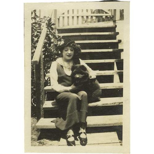 <B>Mabel Normand Personal Photos.</B></I> A charming shot of Mabel and her dog steals the show in this 12-shot packet. The dog obviously loved the camera as much as Mabel did -- there are six pictures of the pup, two with Mabel, who clearly doted on him/her. Also in the lot are six evocative shots of location shooting, including two showing a squad of cameramen (one with a director and a megaphone). All in Very Fine condition.<BR><BR><b>Shipping:</b> Other (oversized items, group lo (<a target="_blank" href="http://www.heritageauctions.com/common/shipping.php">view shipping information</a>) <BR><BR><B>Important notice:</