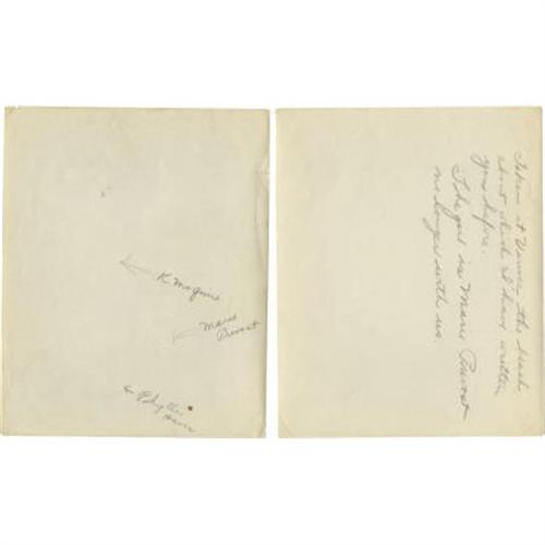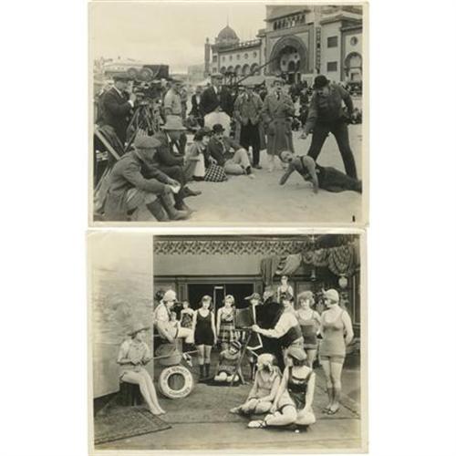 <B>Two of Mabel Normand's Photos of Tragic "Bathing Beauty" Marie Prevost.</B></I> Few Hollywood tragedies were more grim than that suffered by Marie Prevost, who basically starved to death in 1937 -- so pitiful a demise that it sparked the full activation of the Motion Picture Relief Fund. Included are two remarkable pictures from Mabel Normand's collection, each showing Prevost at her loveliest during her Bathing Beauty days for Mack Sennett. The first is an expansive, superbly atmospheric shot of Venice Beach, California, with Marie sitting on the sand as Ben Turpin comically collapses as a life guard. The film crew and camera equipment appear in this wonderful shot. Normand's secretary (presumably) had written on the verso in pencil, "Taken at Venice, the beach about which I have written you before. The girl is Marie Prevost no longer with us." The second shot shows a full gaggle of Bathing Beauties, with a life-saver bearing the legend "Mack Sennet Comedies," and features a charmingly mugging Prevost along with Phyllis Haver (prominent, casting a fishing line) and Kathryn McGuire -- all identified on the reverse in pencil. Both photos are glossy, with only minor creasing and a tiny tear on the right margin of the shot with Haver, and otherwise in Very Fine condition.<BR><BR><b>Shipping:</b> Flat Material, Small (<a target="_blank" href="http://www.heritageauctions.com/common/shipping.php">view shipping information</a>)