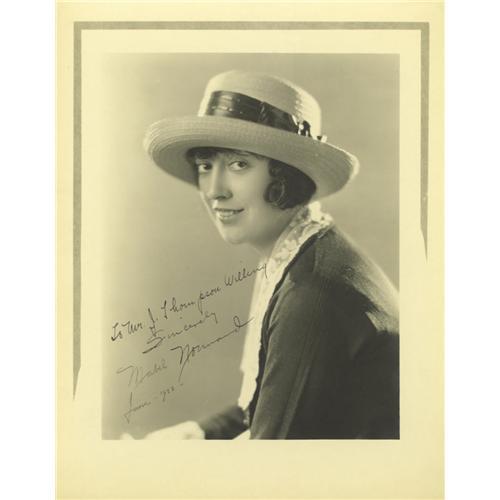 <B>Mabel Normand Signed Photograph, Autographed in the Wake of the William Desmond Taylor Murder Scandal.</B></I> 8" x 10" matte finish portrait of legendary silent screen star Mabel Normand, inscribed "To Mr. J. Thompson Willing Sincerely Mabel Normand June-1922-." Winsome pose presents Normand wearing a straw hat and smiling charmingly at the camera. Normand is a major name in 1920s Hollywood lore, for a variety of reasons - her love affair with Mack Sennett, her reputedly "wild parties" and cocaine addiction, her infamy as a suspect in the William Desmond Taylor murder, her career downfall as the public turned against her and her early death from tuberculosis in 1930 at the age of only 37. Yet she was primarily a triple-threat star/director/writer who was one of the cinema's most endearing all-time great comedy talents. This very rare photo, signed four months after Taylor's murder, is set inside a wide-margin border and movingly captures both Mabel Normand's comic appeal and, in her eyes, a sense of tragedy. Excellent condition. <I>With COA from PSA/DNA.</B></I>