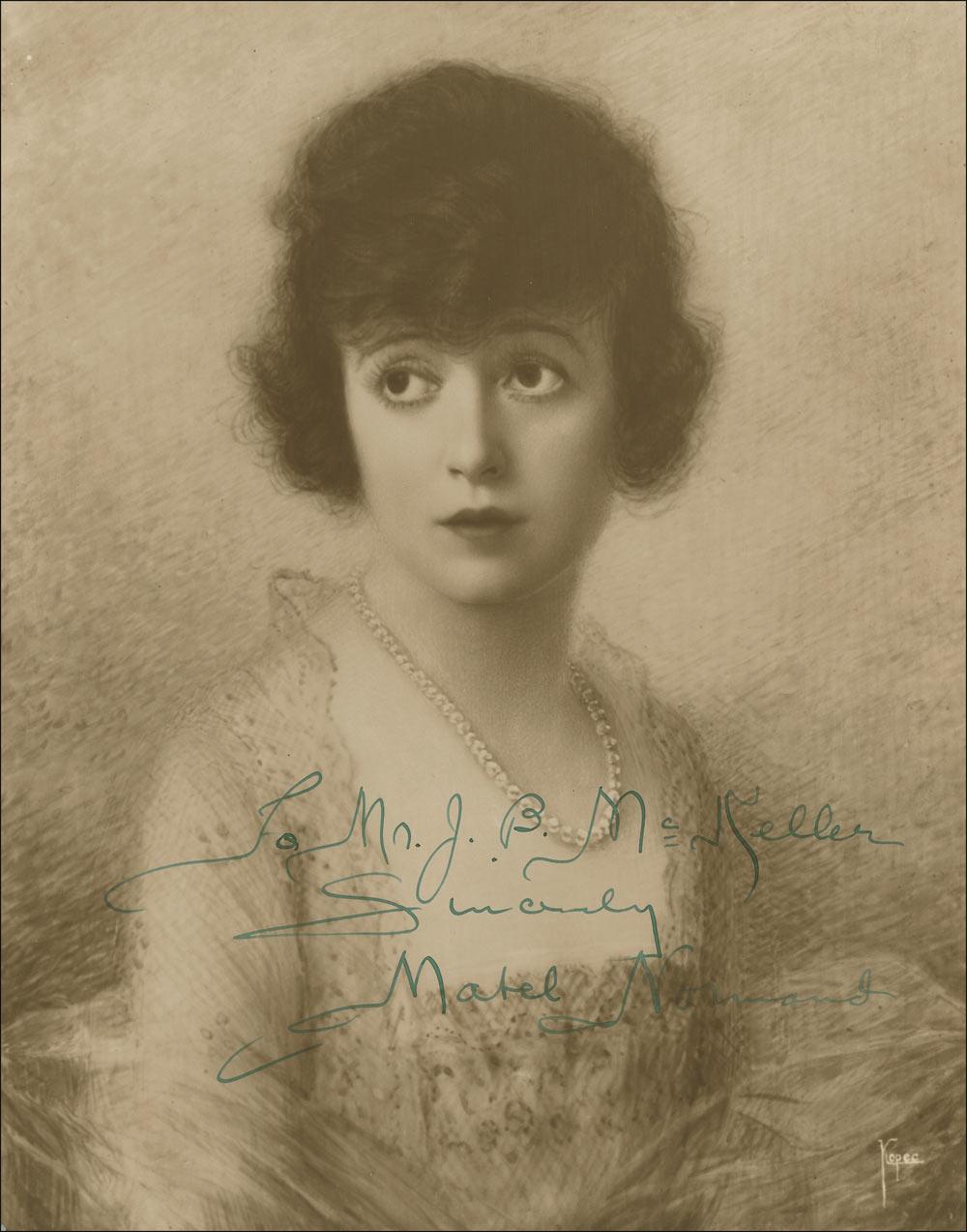 Popular Silent-Era actress (1892-1930) who, after a colorful career that included a number of scandals, died of tuberculosis at age 37. Scarce vintage matte-finish 7.5 x 9.5 photo of an artist’s portrait of Normand, signed and inscribed in green fountain pen “To Mr. J. B. McKeller, Sincerely, Mabel Normand.” In fine condition, with lightly trimmed edges. Throughout the 1920s her name was linked with widely publicized scandals including the 1922 murder of William Desmond Taylor and the 1924 shooting of Courtland S. Dines, who was shot by Normand's chauffeur with her pistol.