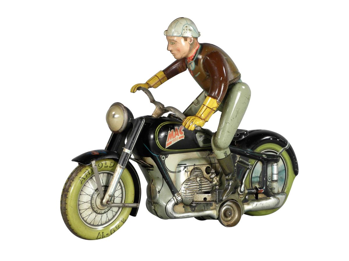 Mac 700 Motorcycle Tin Toy w/rider, key wind powered. Made in US Zone Germany. Some minor discoloration otherwise good condition, comes with key. 7 3/4 inches long.