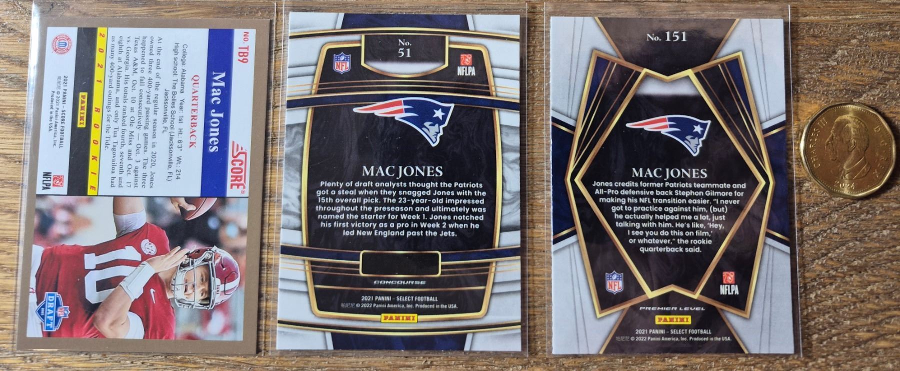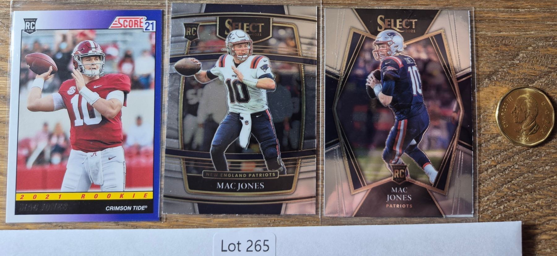 Three-card Mac Jones lot featuring a 2021 Score rookie card and two Select rookie parallels from his debut NFL season.