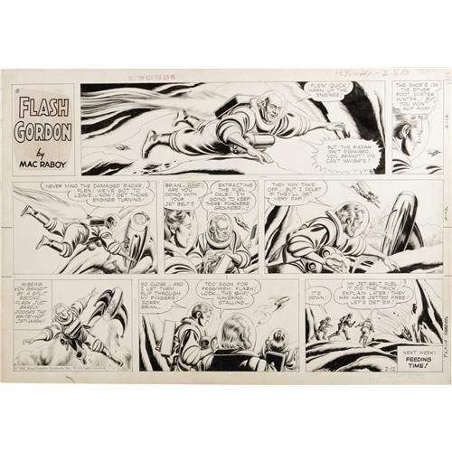 <B>Mac Raboy - Flash Gordon Sunday Comic Strip Original Art, dated 2-12-61 (King Features Syndicate, 1961). </B></I> Mac Raboy was given the chance to fulfill an ambition he had held since childhood when he was given the opportunity to make his own contribution to the iconic character created by his cartooning inspiration, Alex Raymond. As always, the detail of Raboy's brushwork in this <I>Flash Gordon </B></I>Sunday is magnificent, and his intricate "feathering" remains simply unmatched in the comic strip field. The image area of this science fiction sensation measures approximately 19.25" x 13", and the art is in Excellent condition. <BR><BR><b>Shipping:</b> Flat Material, Large (<a target="_blank" href="http://www.heritageauctions.com/common/shipping.php">view shipping information</a>)