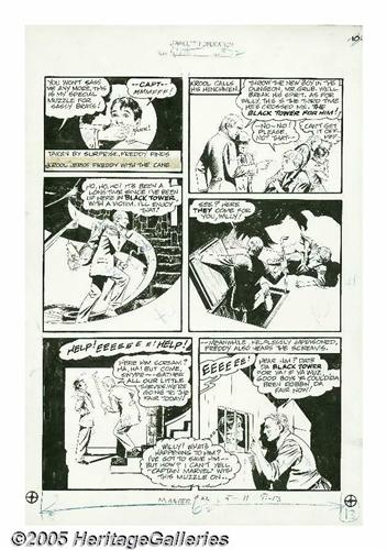 <B>Mac Raboy - Master Comics #32, page 13 Original Art (Fawcett, 1942).</B></I> For many comic art fans, few works are finer than a Mac Raboy Captain Marvel, Jr. page -- and this is a sensational example! The evil Mr. Krool is kidnapping orphans and locking them in the Black Tower to face -- what? That's what Freddy Freeman needs to find out, but he can't yell "Captain Marvel!" and transform into the World's Mightiest Boy because they've clapped a muzzle on him! Funny how these bad guys always seem to instinctively know how to foil this kid's plan! The gorgeous linework from Mac Raboy is suitable for framing. The image area measures 13" x 18". The art has engraver's color notations indicated in blue pencil; there is also a text paste-up missing from the caption in the first panel; otherwise the art is in Excellent condition.