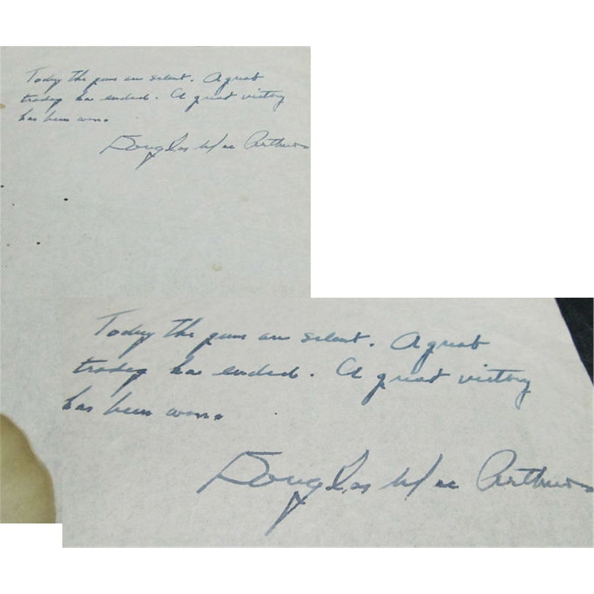 Autograph quotation signed by General Douglas MacArthur which, while reading it, rouses the immense feelings of gravity and joy that must have accompanied every American citizen on 2 September 1945, the day of the Japanese surrender after which MacArthur delivered his radio speech to the American people. His speech began with the words in this handwritten quote: ''Today the guns are silent. A great tragedy has ended. A great victory has been won.'' Additionally signed ''Douglas MacArthur''. Ink quote appears at the top of a sheet that has a circular brown stain on the bottom, easily matted out. MacArthur also seems to incorrectly spell tragedy as ''tradeg'', though not obvious from his handwriting. In very good condition, accompanied by a COA from PSA/DNA.