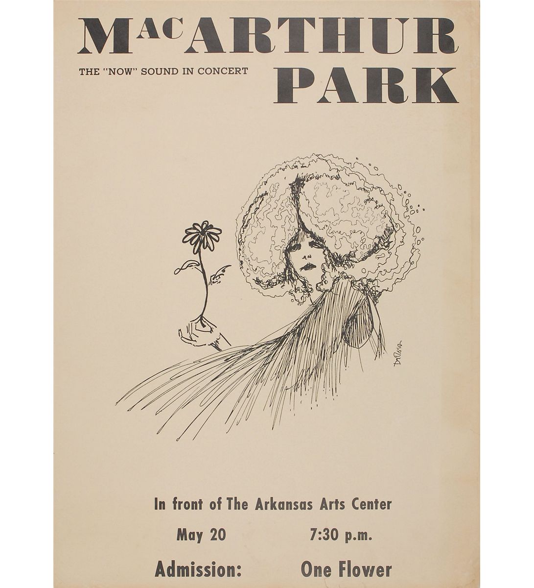 Original 16 x 22 concert poster for MacArthur Park “in front of The Arkansas Arts Center,” with an admission price of “one flower.” In very good condition, with scattered creases, mainly to edges and corners, some small edge tears, and a strip of toning along right edge.