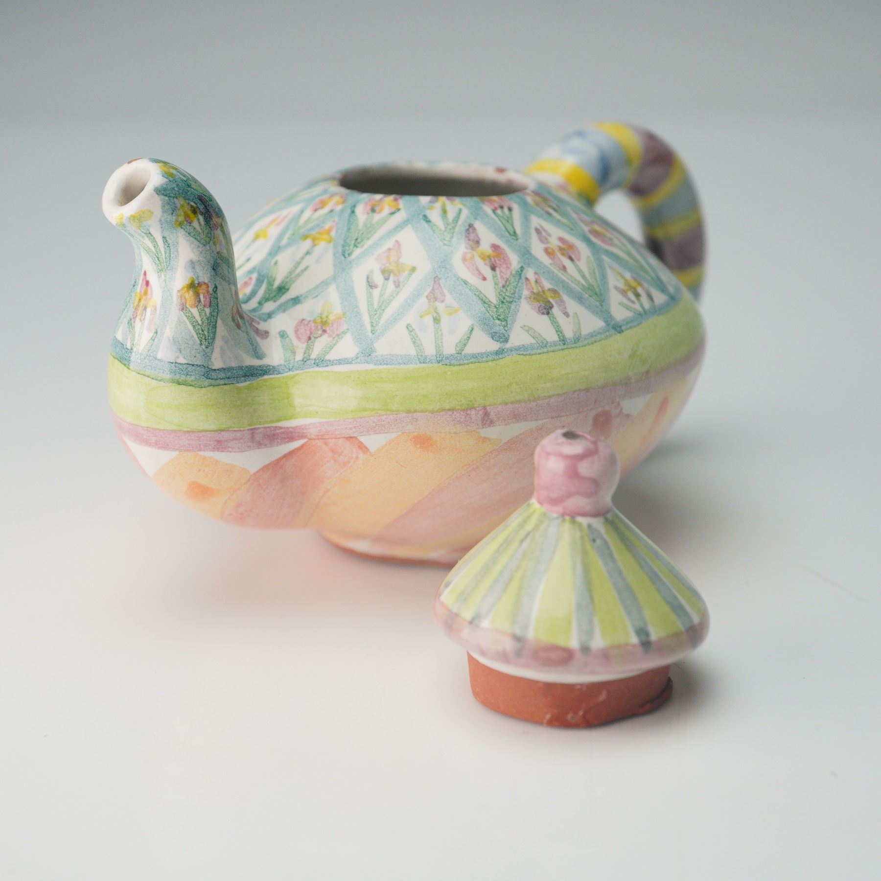 A spectacular example of the whimsical artistry of MacKenzie-Childs, this hand-painted teapot in the beloved Heather pattern dazzles with its pastel charm and playful geometric florals. Dated 1995 and crafted in Aurora, New York, the piece features a delightfully rotund form with swirling diagonal bands of peach and rose at the base, rising to a domed lid crowned with a striped finial. The body is adorned with a trellis of hand-drawn blossoms in a palette of mint green, sunshine yellow, lavender, and soft pinks, while the handle spirals in candy-cane stripes of lilac, citron, and sky blue. The spout, like a blooming flower, completes the joyful silhouette of this collectible treasure. A quintessential piece for any MacKenzie-Childs enthusiast or lover of postmodern American ceramics.