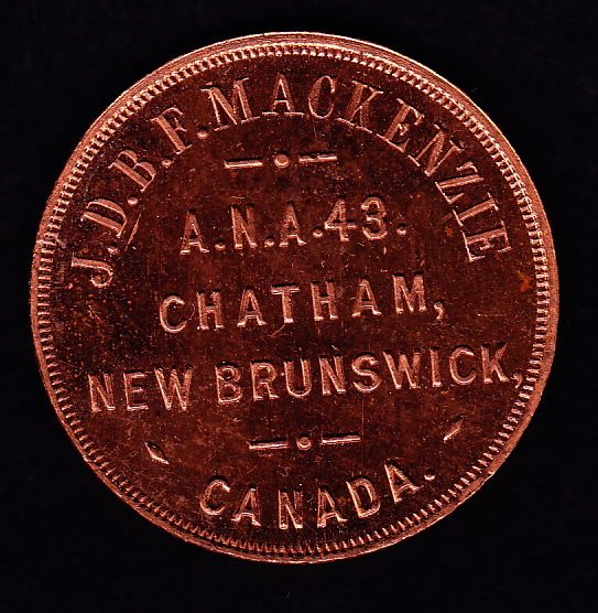 MacKenzie Personal Token - This personal token in copper, was issued by JDBF MacKenzie of Chatham New Brunswick. He was ANA Member #43, making him one of Canada's very early members of that Association. He collected old coins, tokens, and medals; however, his collection of Presbyterian tokens was outstanding. Cu, 30mm, Unc.