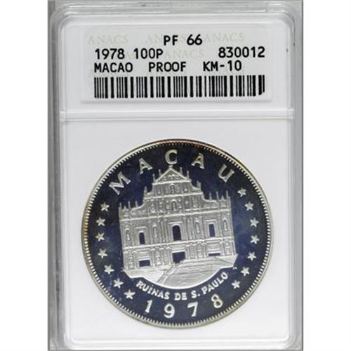 <B>100 Patacas silver 1978,</B></I> KM-10, PR66 ANACS.<BR><BR><b>Shipping:</b> Coins & Currency (<a target="_blank" href="http://www.heritageauctions.com/common/shipping.php">view shipping information</a>)