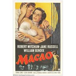 Macao (RKO, 1952). One Sheet (27" X 41"). Sleepy-eyed Robert Mitchum plays an ex-GI on the run from the law and ends up in a scheme to capture a seedy nightclub owner in Macao who's wanted for murder in New York. The movie feature's a who's who in film noir with Mitchum, William Bendix, Jane Russell and Gloria Grahame. It was partially directed by Josef von Sternberg and finished by "Rebel Without a Cause" director Nicholas Ray! Very Fine on Linen. Important notice: Heritage usually auctions material at the rate of 200-250 lots per hour. On some occasions eBay Live bid software or the Internet may not be able to keep up with the pace of the auction. We recommend placing a realistic absentee bid now as insurance to avoid disappointment. Occasionally the auctioneer may eliminate or reject an eBay Live bid, and the auctioneer may also reopen a lot after the close of the eBay live bidding (usually because we missed an audience bid), and may reject your bid even if it shows you as the winning bidder. By bidding via eBay Live, you agree that Heritage may award the lot to another bidder at its sole discretion under the circumstances described above or any other reasonable circumstances. Also please note that all Heritage lots purchased through eBay Live carry a 20% Buyer's Premium. Please make sure you read the Terms and Conditions before you bid.