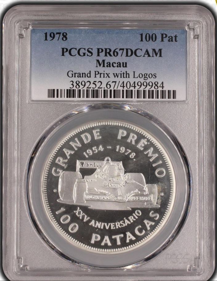 Macau, 1978, 100 Pat,Grand Prix with Logos, proof silver coin. PCGS PR67DCAM. Rare.