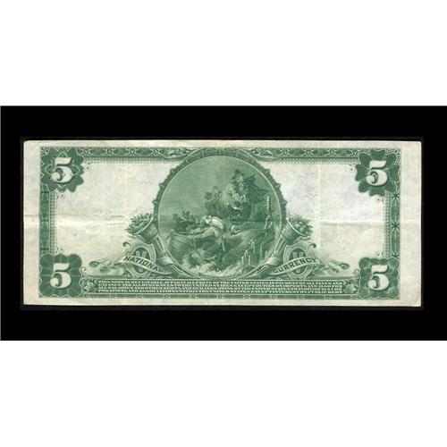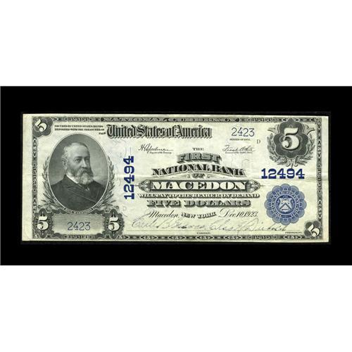 <B>Macedon, NY</B></I> - $5 1902 Plain Back Fr. 609 <B>The First NB</B></I> Ch. # 12494<BR>A beautiful note from this just plain rare Wayne County issuer. This piece is new to the census , which now stands at only five large and two small notes. crackling fresh <B>Very Fine-Extremely Fine,</B></I> with bright white paper and great color.