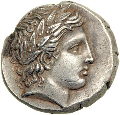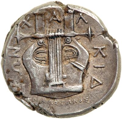 Macedon. Olynthos, Chalkidian League, 420-355 BC. AR Tetradrachm (14.46 g). Laureate head right of Apollo. Reverse: Kithara with six strings; below, magistrate's name. SNG ANS 496; Dewing 1071. Slight reverse roughness. NGC graded Choice AU: Strike 4/5; Surface 4/5. Fine Style, encrustation. Our grade is Extremely Fine.