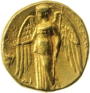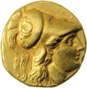 Mondo Greco. Grecia Continentale. Macedonia. Alessandro Magno (336-323 a.C.). Statere d'oro, zecca incerta. D/ Testa di Athena a destra. R/ AΛEΞANΔPOY. Nike stante a sinistra tiene corona e albero di nave. Nel campo a sinistra, simbolo. Sotto, ΔI. Price 3969. Muller 121. AU. g. 8.51 mm. 16.50 Bel BB. Fondi lucenti.
