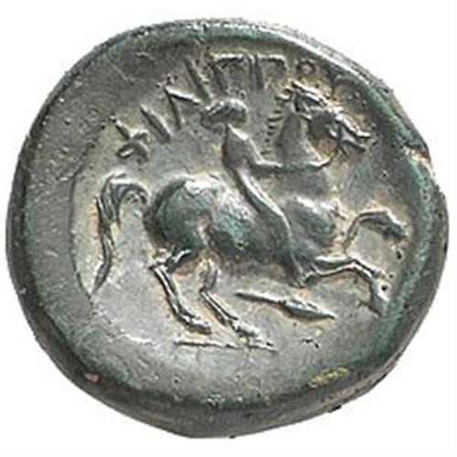 Mondo Greco. Grecia Continentale. Macedonia. Filippo II (359-336 a.C.). AE 18 mm. D/ Testa di Apollo a destra, con taenia. R/ Œ¶ŒôŒõŒôŒŒŒüŒ•. Cavaliere nudo su cavallo scalpitante a destra. Sotto, punta di lancia. Grose 3375. gr. 7.16 AE. qSPL. Bellissima patina smalto verde oliva.