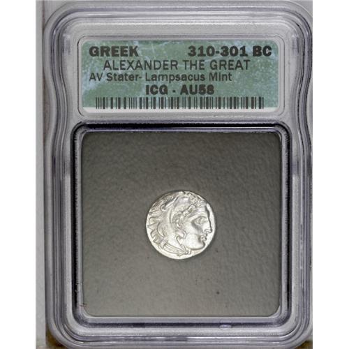 <B>Macedonian Kingdom. Alexander III.</B></I> 336-323 B.C. AR drachm (16 mm). Lampsakos, 310-301 B.C. Head of Herakles right, wearing lion's skin headdress / Zeus seated left, holding eagle and sceptre; Pegasos forepart before, monogram below. Price 1382; Müller 612. AU58 ICG.
