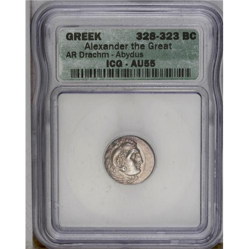 <B>Macedonian Kingdom. Alexander III.</B></I> 336-323 B.C. AR drachm (17 mm). Abydos, ca. 328-323 B.C. Head of Herakles right, wearing lion's skin headdress / Zeus seated left, holding eagle and sceptre; Pegasos forepart before, monogram below. Price 1505; Müller 610. AU55 ICG.
