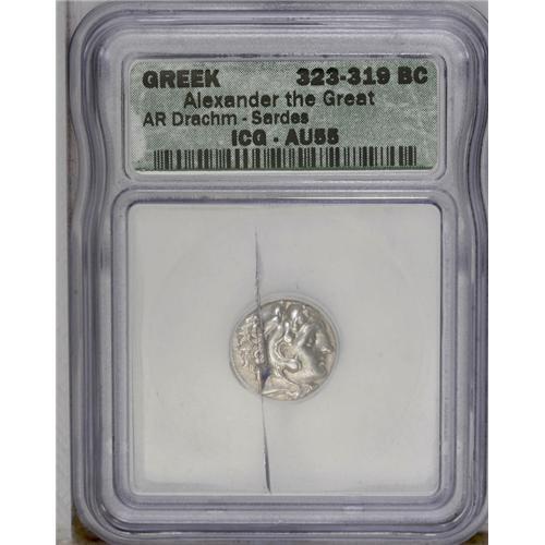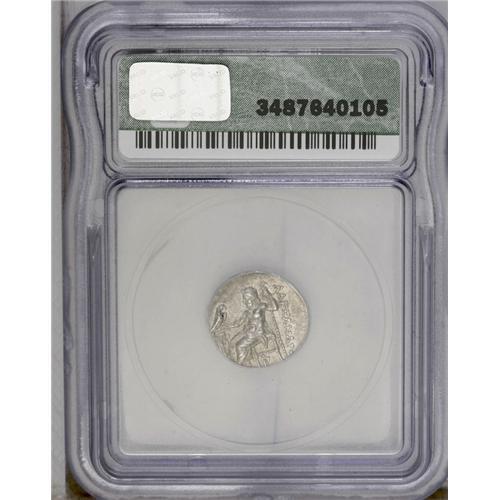 <B>Macedonian Kingdom. Alexander III.</B></I> 336-323 B.C. AR drachm (16 mm). 'Kolophon', ca. 323-ca. 319 B.C. Head of Herakles right, wearing lion's skin headdress / Zeus seated left, holding eagle and sceptre; lyre before, letter below. Price 1770; Müller 242. AU55 ICG (mint incorrectly identified as Sardis).