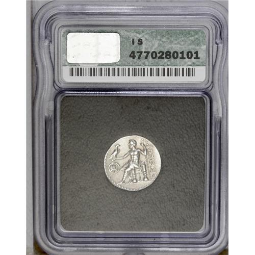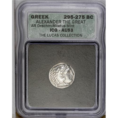 <B>Macedonian Kingdom. Alexander III.</B></I> 336-323 B.C. AR drachm (18 mm). Miletos, 295-275 B.C. Head of Herakles right, wearing lion's skin headdress / Zeus seated left, holding eagle and sceptre; monogram before, labrys below. Price 2148; Müller 1139. AU53 ICG.
