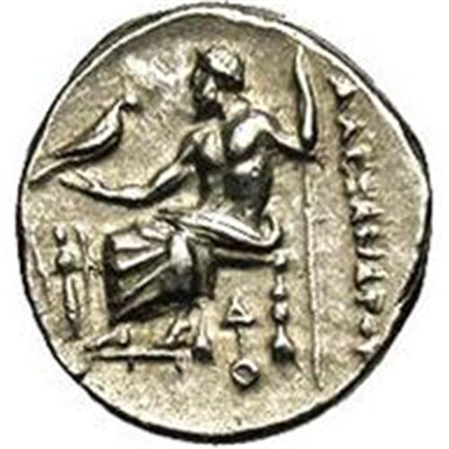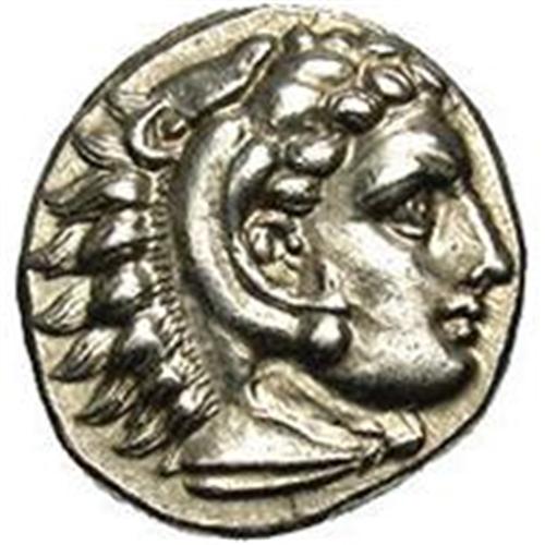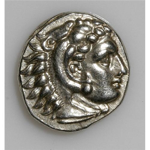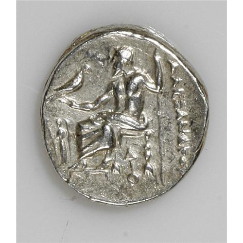 <B>Macedonian Kingdom. Alexander III.</B></I> 336-323 B.C. AR drachm (16 mm, 4.27 g). Lampsakos, 328-323 B.C. Head of Herakles right, wearing lion's skin headdress / Zeus seated left, holding eagle and sceptre; Artemis to left, monogram below. Price 1356; Müller 398. Good VF.