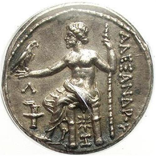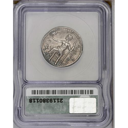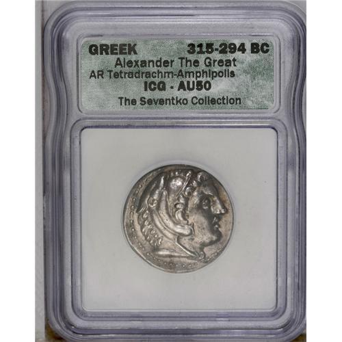 <B>Macedonian Kingdom. Alexander III.</B></I> 336-323 B.C. AR tetradrachm (26 mm, 17.07 g). Amphipolis, ca. 315-294 B.C. Head of Herakles right, wearing lion's skin headdress / Zeus seated left, holding eagle and sceptre; letter and torch left, star and letter below throne. Price 479; Müller 66. AU50 ICG. <I>Ex Seventko Collection (HWCA 296, 29 July 2002), 11052; CNG XXVII (29 September 1993), 437.</B></I>