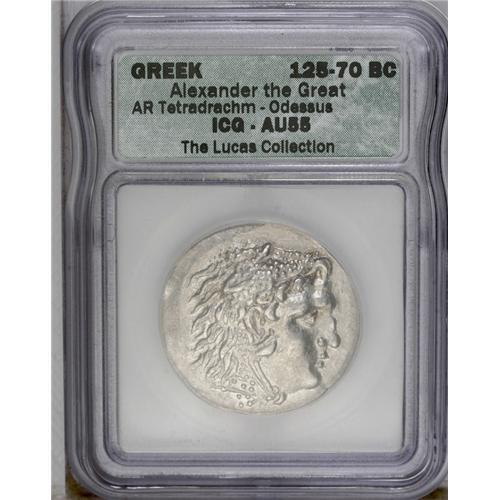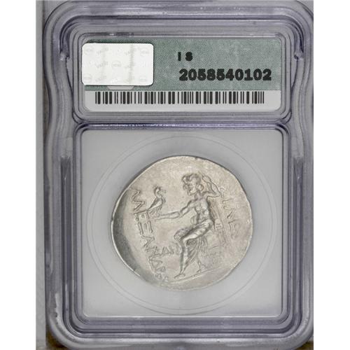 <B>Macedonian Kingdom. Alexander III.</B></I> 336-323 B.C. AR tetradrachm (32 mm). Odessos, ca. 125-70 B.C. Head of Herakles right, wearing lion's skin headdress / Zeus seated left, holding eagle and sceptre; letters before, monogram below. Price 1180; Müller 423. AU55 ICG.