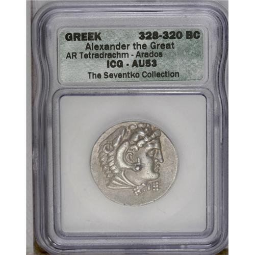 <B>Macedonian Kingdom. Alexander III.</B></I> 336-323 B.C. AR tetradrachm (28 mm, 16.79 g). Arados, ca. 328-320 B.C. Head of Herakles right, wearing lion's skin headdress; small B behind / Zeus seated left, holding eagle and sceptre; monogram below throne. Price 3308; Müller -. AU53 ICG. <I>Ex Seventko Collection (HWCA 296, 29 July 2002), 11049.</B></I>