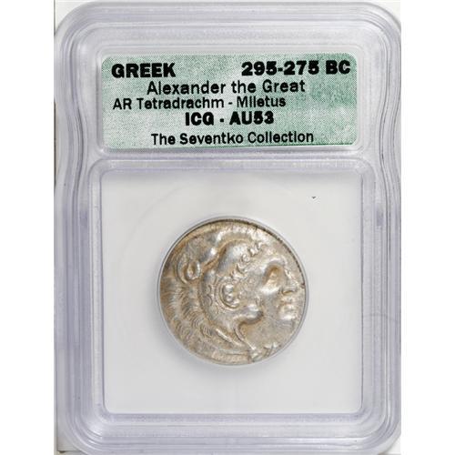 <B>Macedonian Kingdom. Alexander III.</B></I> 336-323 B.C. AR tetradrachm (26 mm). Miletos, 295-275 B.C. Head of Herakles right, wearing lion's skin headdress / Zeus seated left, holding eagle and sceptre; monogram, star and lion in left field, monogram beneath throne. Price 2158; Meydancikkale 1571-5; Müller 1034. <B>AU53 ICG.</B></I> <I>Ex Seventko Collection.</B></I> <BR><BR><b>Shipping:</b> Coin/Currency (<a target="_blank" href="http://www.heritageauctions.com/common/shipping.php">view shipping information</a>)