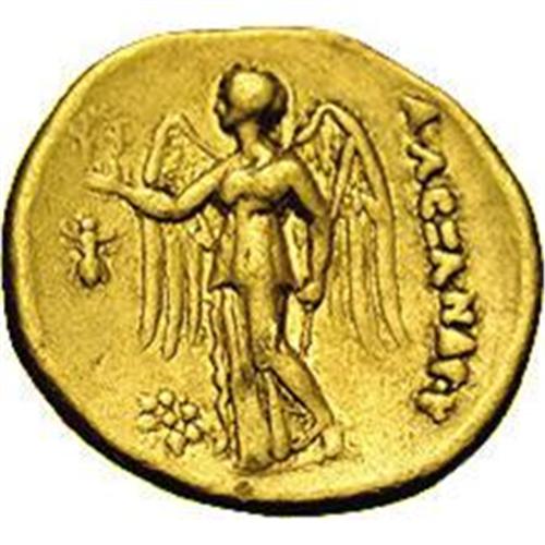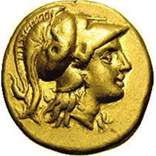 <B>Macedonian Kingdom. Alexander III.</B></I> 336-323 B.C. AV stater (18 mm, 8.52 g). Uncertain mint in Macedon, 310-275 B.C. Head of Athena right, wearing crested Corinthian style helmet, the bowl of which is ornamented with a coiled serpent / Nike standing left, holding wreath and stylis; ant in left field, star under wing. Price 831; Müller 179. VF.