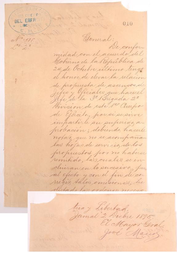 Maceo, José (1849-1896) Brother of Cuban liberator Antonio Maceo and a key player in Cuba's struggle for independence. Letter signed as Major General in purple ink, 1¼ pages, in Spanish, 8½ x 6", Jamal, Dec. 2, 1895. To Major General Maximo Gomez, General in Chief of the Liberation Army, announcing that he will send his proposal for military promotions for the 3rd Brigade, 2nd Division of the 1st Corps. Upper left corner has an original stamp of the "Republica de Cuba -- 1ro Cuerpo del Ejercito Libertador E.M.G." Small paper loss at upper right corner affects nothing. In October 1868, José Maceo and his famous brother Antonio joined Carlos Manuel de Cespedes' group in Cuba's First War of Independence (1868-1878). In the second, and successful, war (1895-1898), Antonio became the leader and symbol of the war and José was military commander of Cuba's Oriente (eastern) province. Early in July 1896, José resigned his post as commander of the Oriente province to allow Calixto Garcia to take over. José was killed at the battle of Loma del Gato on July 5, 1896.