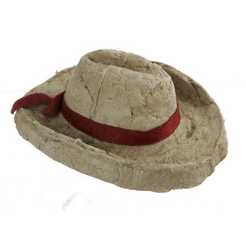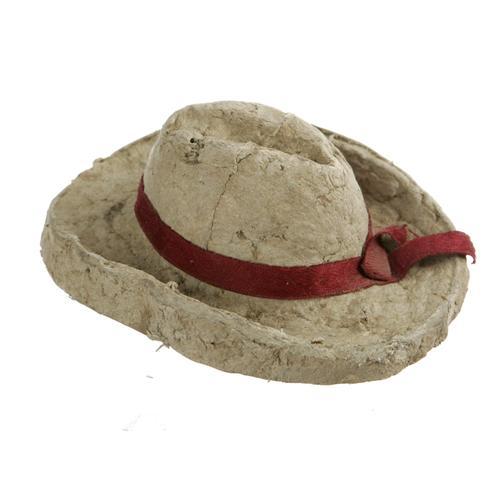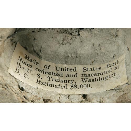 <B>Macerated Currency Hat.</B></I> This is a very nice 1 1/2 inch tall macerated hat that has retained its original red ribbon around the crown. Inside the hat is a label that reads "Made of United States bank notes redeemed and macerated at the U.S. Treasury, Washington D.C. Estimated Amount $8,000." A solid example of this quaint craft.