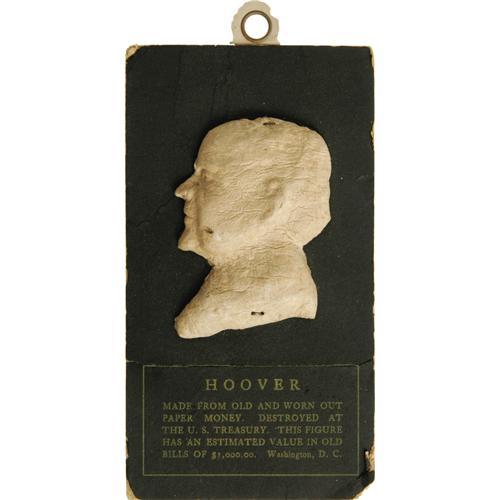 <B>Macerated Currency Silhouette of President Herbert Hoover.</B></I> This is a macerated currency card done near the end of the craze. It exhibits a good likeness of President Hoover, 1929-33. There is a lateral crease below the portrait and the edges show some wear. An eyelet has been attached. Macerated currency items were generally sold in Washington, DC as souvenirs.<BR><BR><b>Shipping:</b> Coins & Currency (<a target="_blank" href="http://www.heritageauctions.com/common/shipping.php">view shipping information</a>)