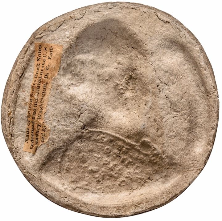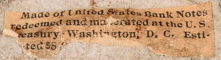 This original example of Macerated Currency measures 3.75” in diameter. Original partial paper label still attached to reverse reads; “Made of United States Bank Notes redeemed and macerated at the U.S. Treasury, Washington, D.C. Esti(ma)ted $5,(000)”. Raised portrait of Washington with inscription that reads; “First in war, first in peace and first in the hearts of his countrymen”.