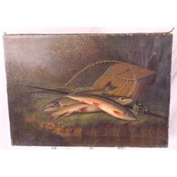 "Machen" oil painting on canvas of still life with trout, fly rod, net and creel; Ca. 1865; possibly William Henry Machen (1832-1911); signed lower right; depicts 3 rainbow trout piled on the bank of a stream in front of a fly fishing rod, bentwood fish net and wicker woven creel; the fishing line with tied fly lure rests to the left of the fish; condition is "as found" with 3 small punctures including one on a trout; scattered speckled paint loss at upper left; unframed; 24" long x 17" tall